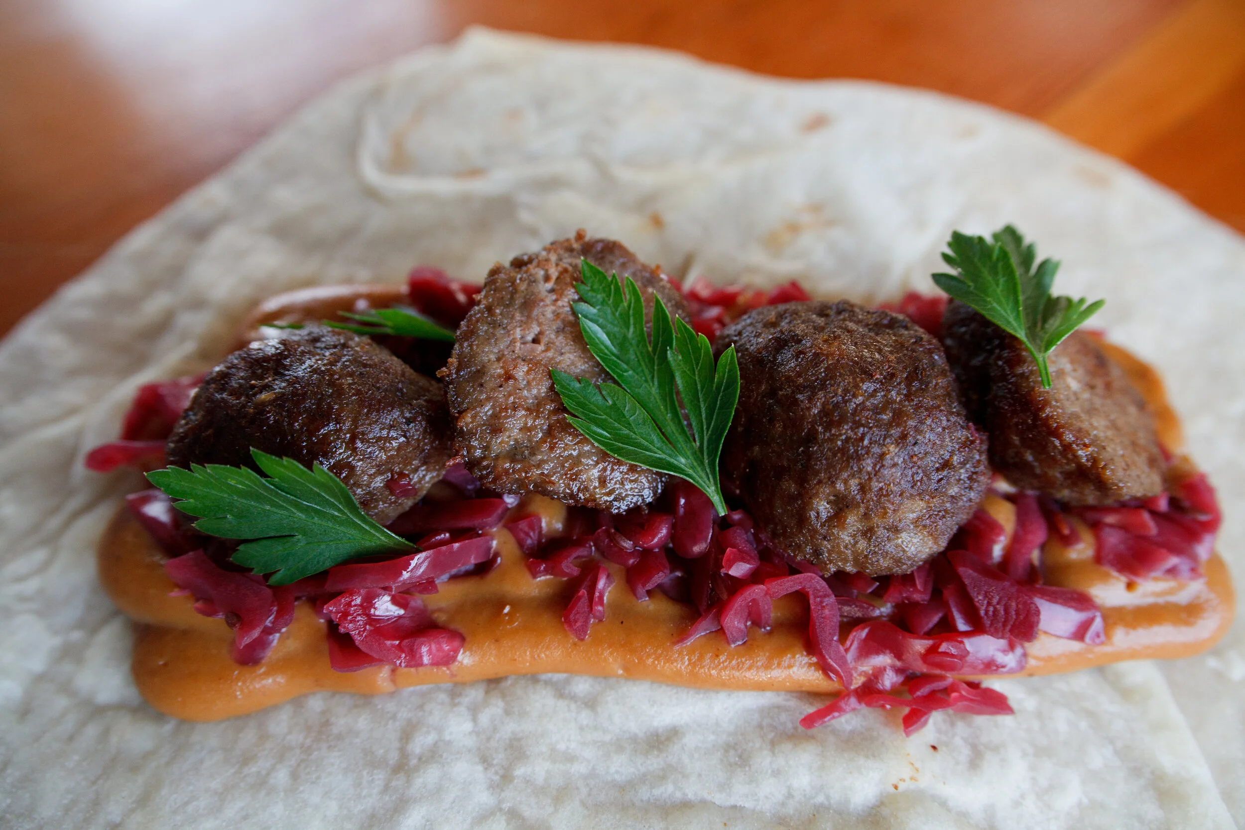 Pork and beef meatballs, served with a Gjetost/Norwegian caramelized cheese gravy, surkal (pickled purple cabbage) and green cabbage. *Contains gluten, sunflower and flax seeds.